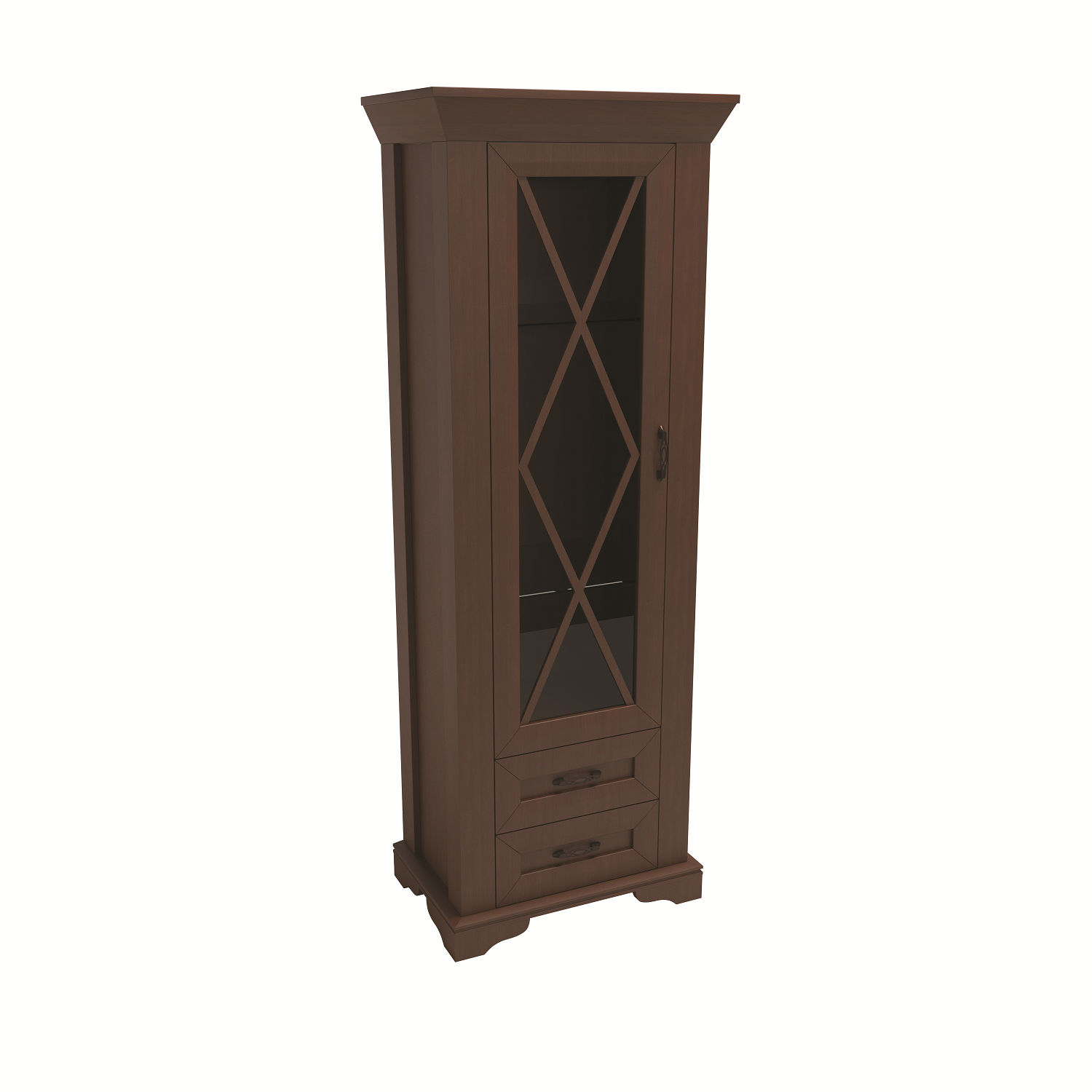 Elegantna jednokrilna vitrina iz Serije X savršen je izbor za klasično i moderno uređen enterijer. Izrađena u toploj orah boji, vitrina se ističe staklenim vratima sa dekorativnim prečkama koje daju sofisticiran i bezvremenski izgled.
