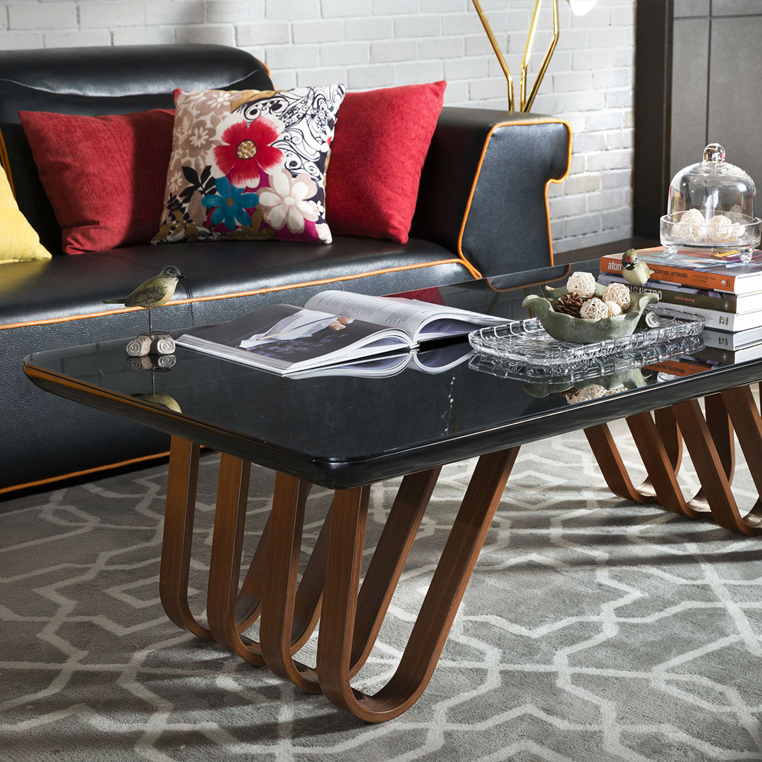 Model klub stola koji se lako može prilagoditi modernom ambijentu dnevne sobe , sa pločom od farbanog medijapana u visokom sjaju sa kaljenim staklom debljine 6m u crnoj boji i metalnim nogama , presvučenim folijom u boji drveta .