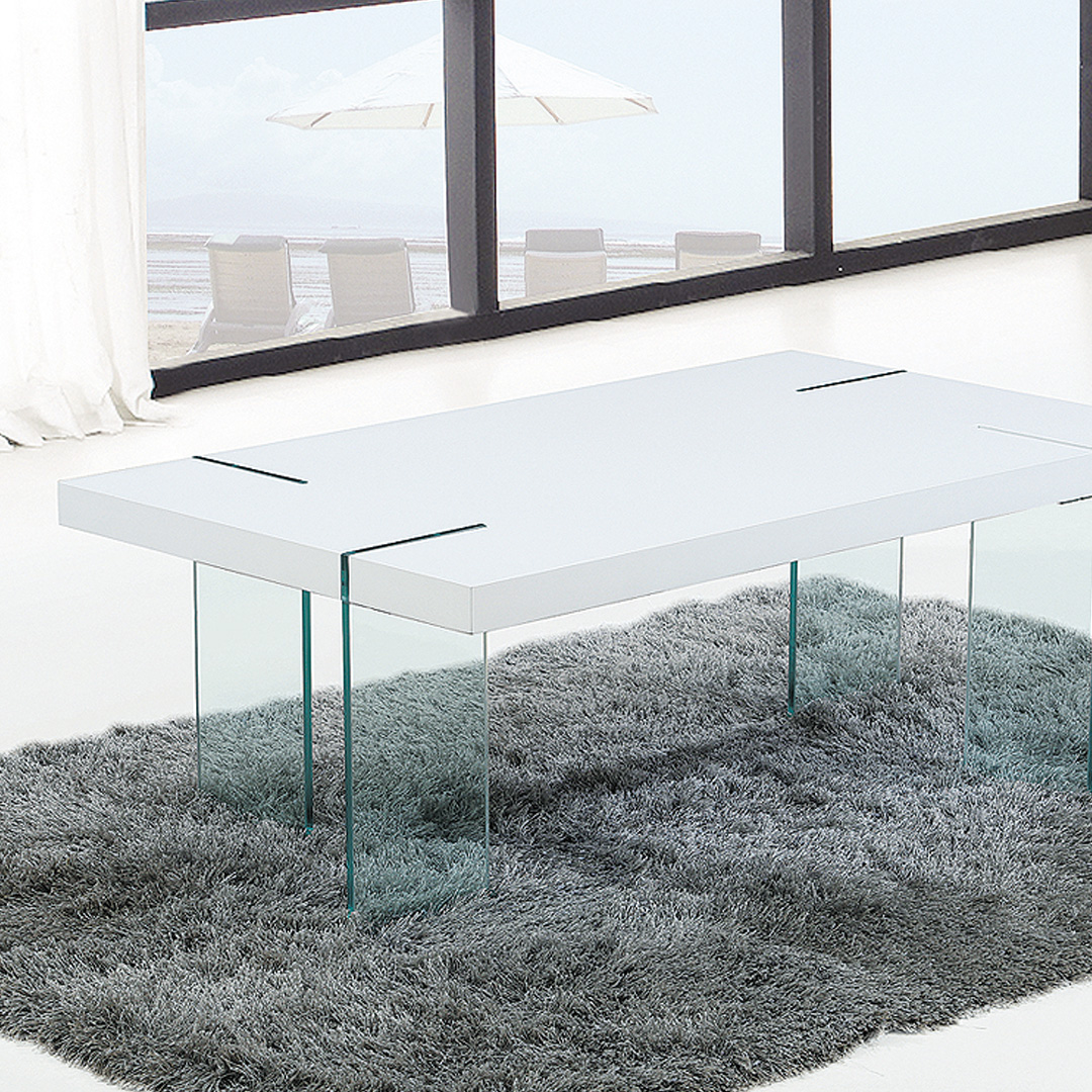 Veoma neobičan sto , specifičnog dizajna u kombinaciji stakla i medijapana u beloj boji.