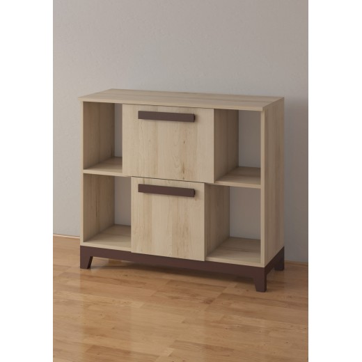 Moderna komoda jednostavnog i elegantnog dizajna, izrađena u svetlom drvenom dekoru sa diskretnim tamnim ručkama i stabilnim postoljem. Kombinacija zatvorenog prostora iza dvoja vrata i otvorenih polica sa obe strane omogućava pregledno i funkcionalno odlaganje.