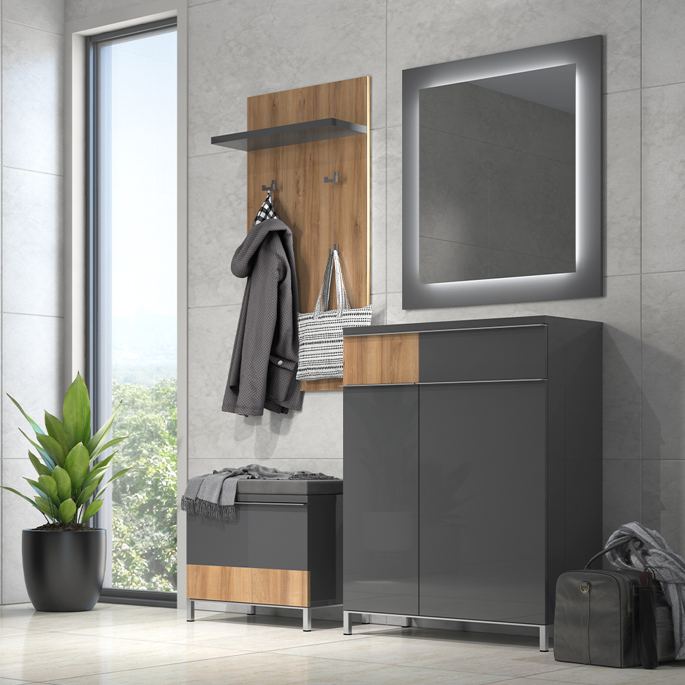 - vidljivi delovi komode lakirani su UV lakom u visokom sjaju u artaktivnoj Antracit boji sa aplikacijom u drvodekoru Pacifik orah;