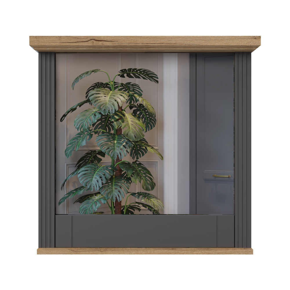 Ogledalo za predsoblje, iz kolekcije TARA, sa ramom od stilski profilisanih lajsni izrađenih od medijapana kompletno lakiranog UV lakom sa soft mat efektom u grafit boji i masivnom pokrivnom pločom u dekoru Pacifik orah .