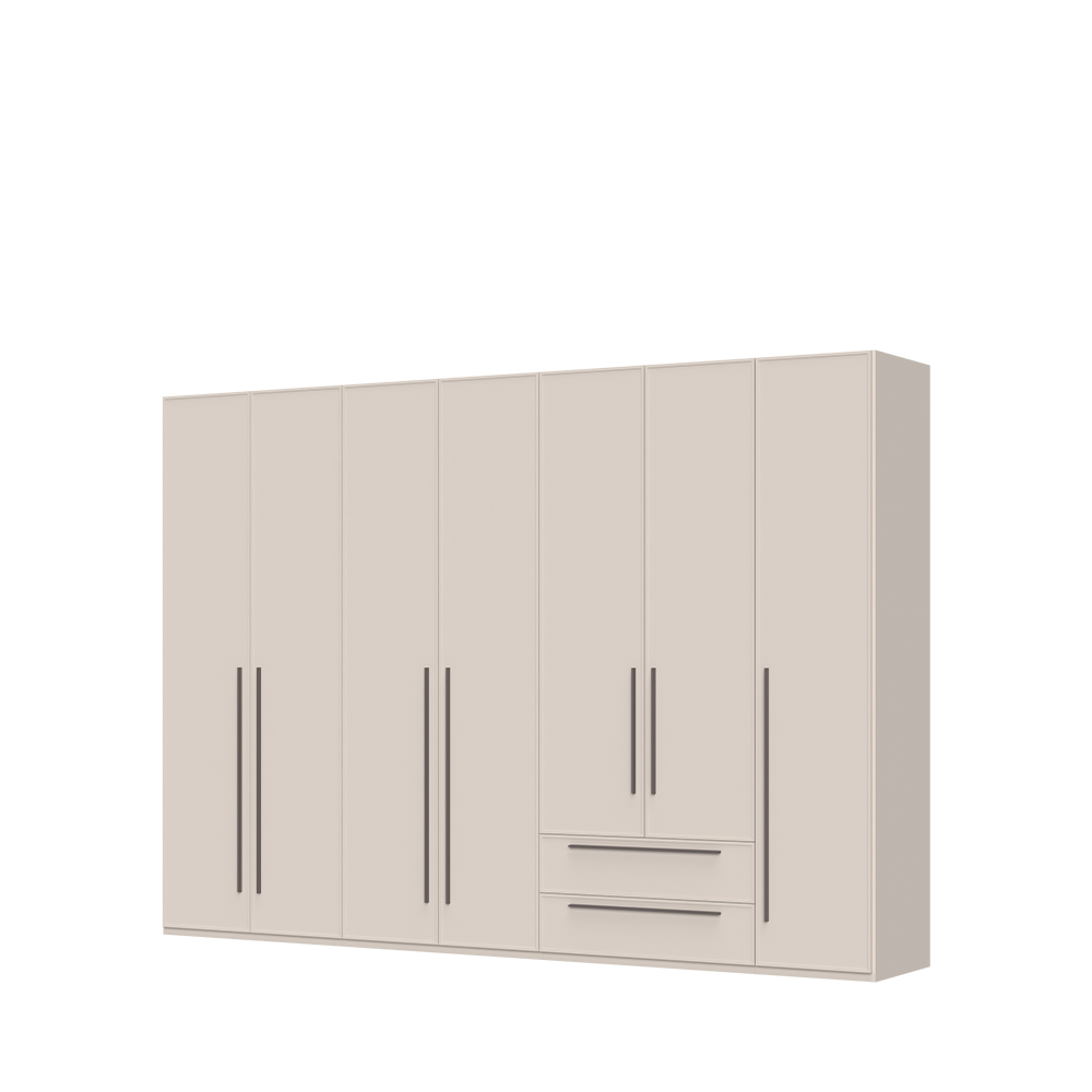 Sedmokrilni plakar OPERA nudi prostranost i sofisticiran dizajn za svaku spavaću sobu. Ovaj model je lakiran u elegantnoj boji Kašmir, sa soft mat UV završnicom koja dodaje luksuzan izgled. Frontovi su oplemenjeni MDF ramovima sa dekorativnim profilima, a unutrašnjost je obložena dekorom Textil, pružajući vizuelni i funkcionalni užitak. Plakar sadrži 10 polica i 4 garderobne šipke, pružajući optimalnu organizaciju. Podesive nožice i ručke u Cortado braon mat nijansi doprinose estetskoj i funkcionalnoj vrednosti.