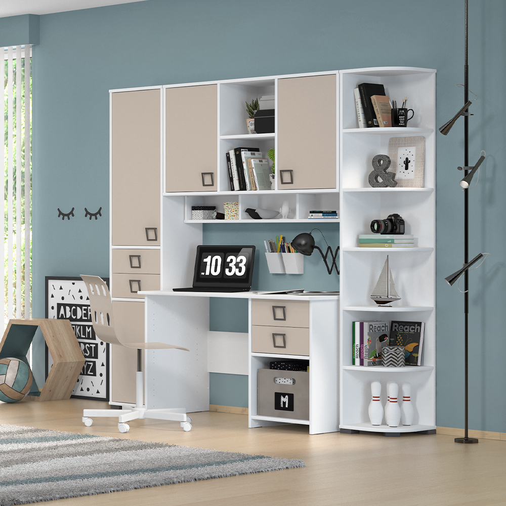 Ugaoni element sa pet polica, čija je visina prilagođena visini garderobera i vitrina. Koristi se kao završni element konfiguracije