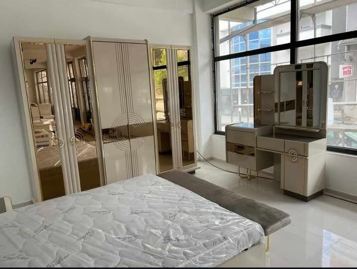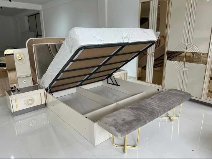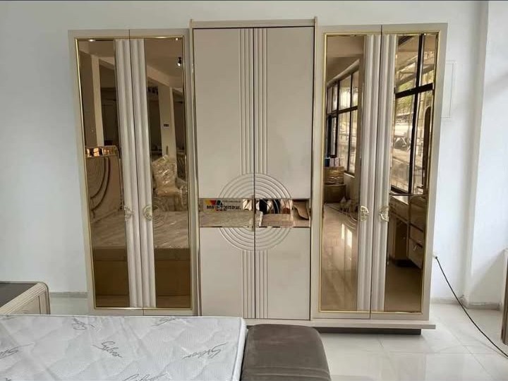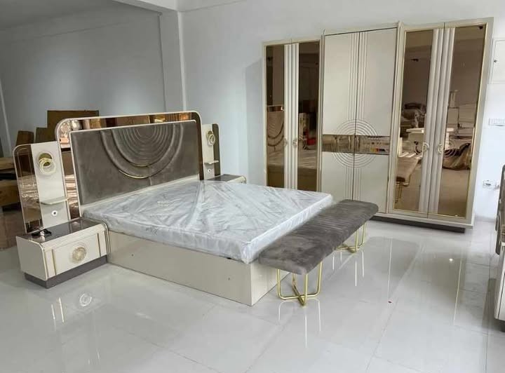 Spavaća soba Saray predstavlja savršen spoj luksuza, modernog dizajna i funkcionalnosti. Dominantni tonovi bež i šampanj boje, u kombinaciji sa zlatnim detaljima i ogledalima, daju prostoru sofisticiran i elegantan izgled.
