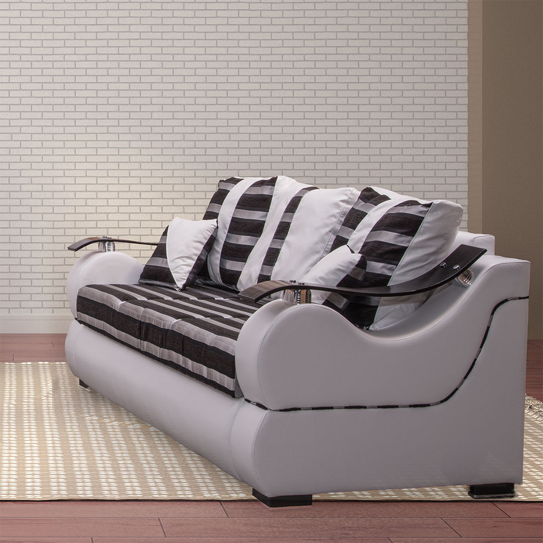 Veoma neobican dizajn , prakticnost i drvene aplikacije cine ovaj trosed veoma popularnim među našim klijentima . Trosed ima latofleks mehanizam za spavanje , sedište od sunđera gustine 28kg/m3 i konstrukciju od drveta . Može biti izrađen od platna ,eko-kože ili kombinacije ova dva materijala.