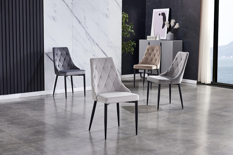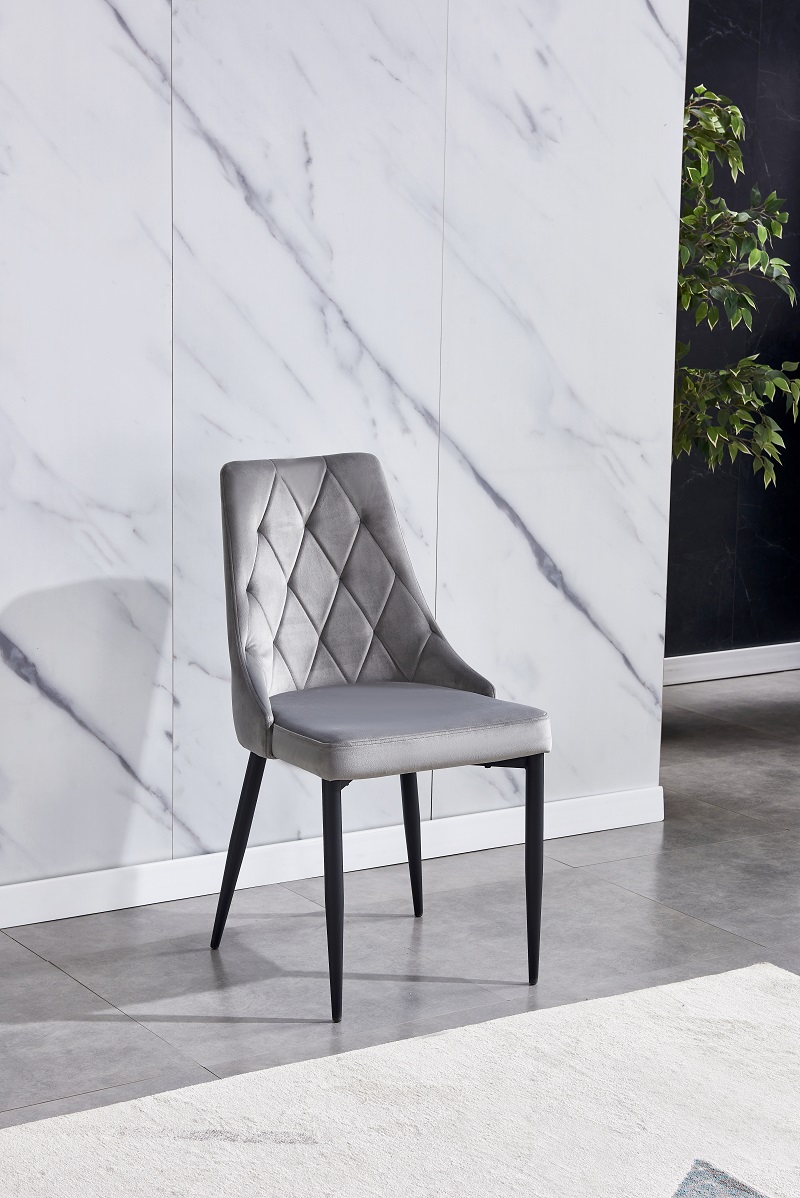 Elegantna trpezarijska stolica,Stolica je tapacirana kvalitetnom tkaninom, a naslon je prošiven ukrasnim šavovima u obliku rombova. Osnova stolice je od metala u crnoj boji. Maksimalno moguće opterećenje stolice je 120 kg.