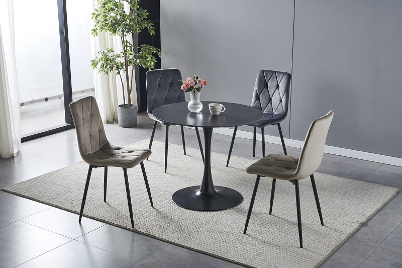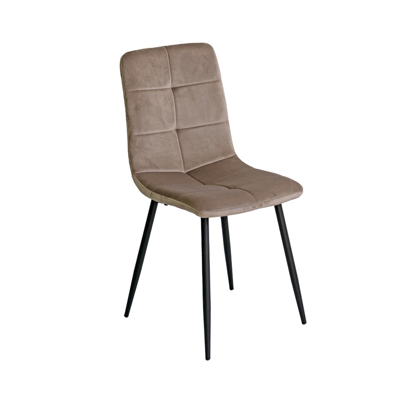 Jednostavna trpezarijska stolica. Stolica je tapacirana kvalitetnom tkaninom, a naslon je prošiven ukrasnim šavovima. Osnova stolice je od metala u crnoj boji Maksimalno moguće opterećenje stolice je 120 kg.