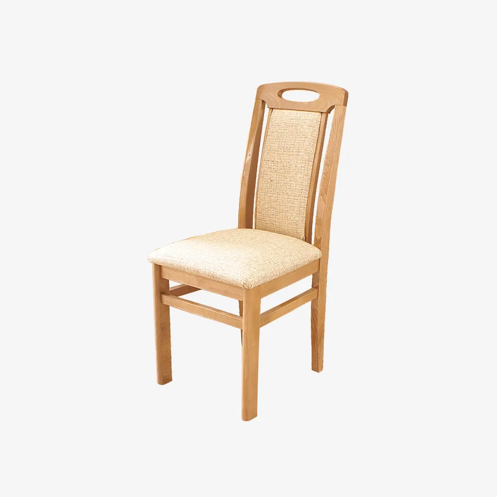 Tapacirano sedište i naslon omogućavaju prijatno sedenje, dok drvena konstrukcija obezbeđuje stabilnost i dugotrajnost.