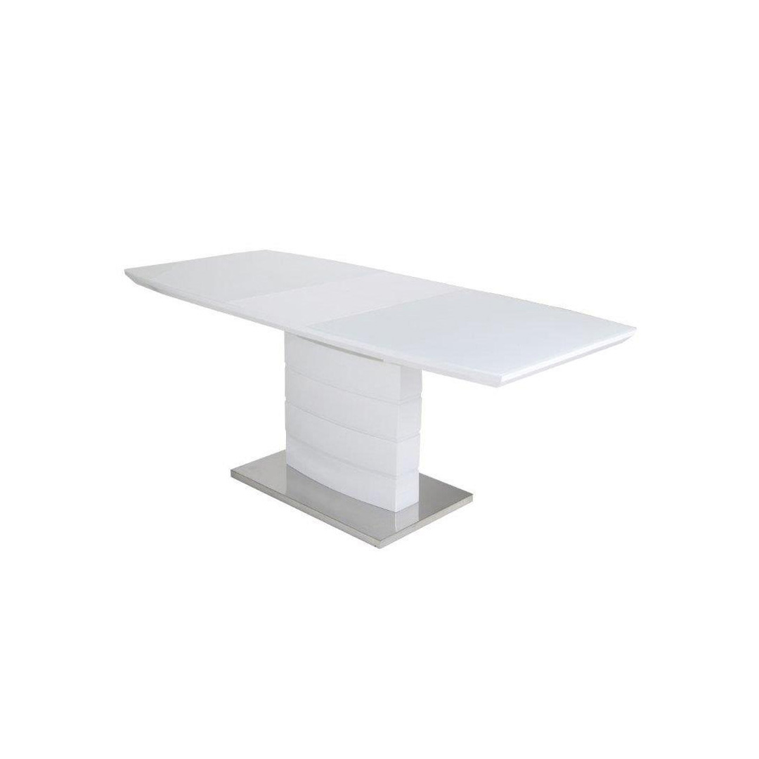 Trpezarijski sto DT122 sa pločom od farbanog medijapana u visokom sjaju u boji cappuccino ili beloj boji . Stub stola je od farbanog medijapana u visokom sjaju . Postojle je metalno-hromirano.