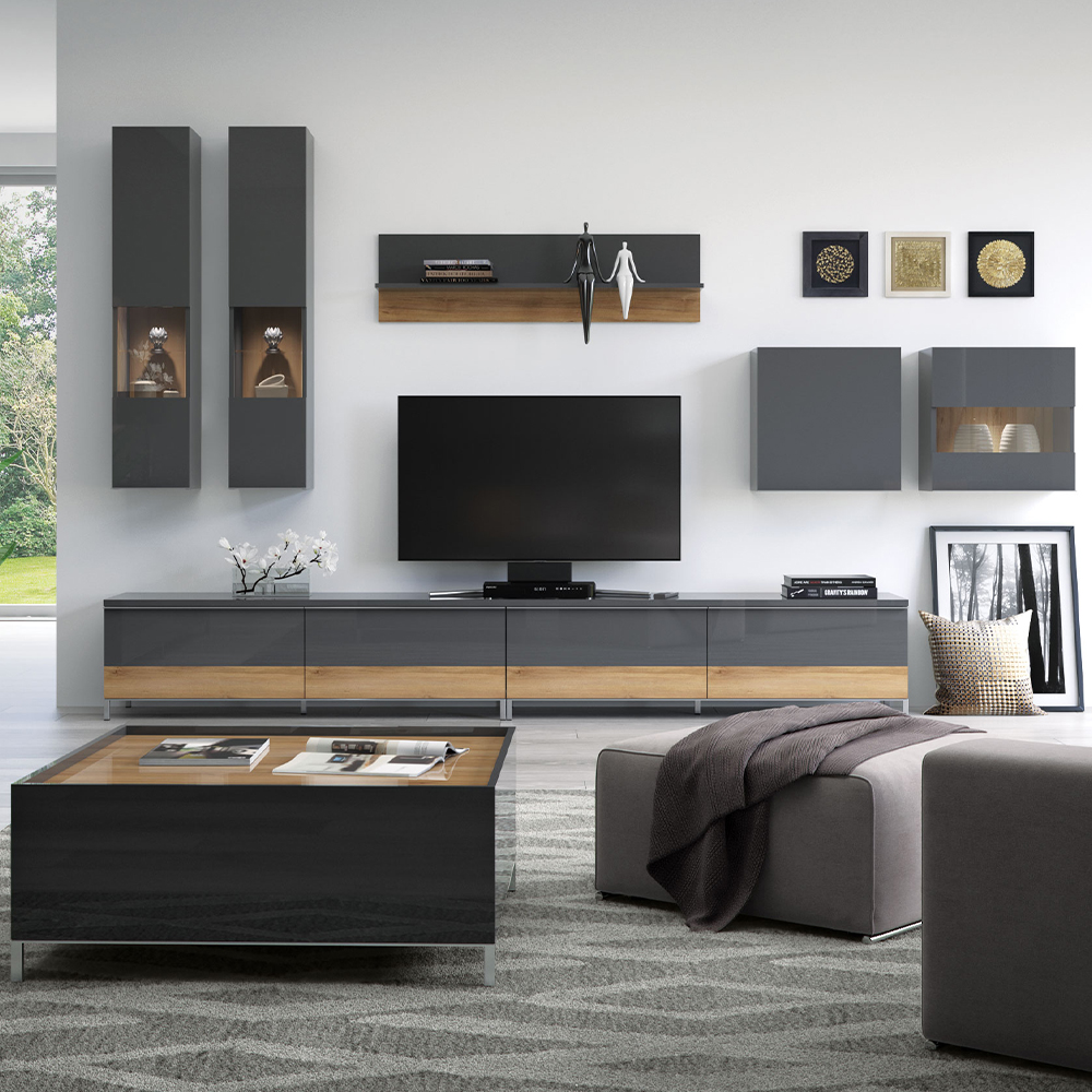 • vidljivi delovi elementa lakirani su UV lakom u visokom sjaju u artaktivnoj Antracit boji sa aplikacijama u drvodekoru Pacifik orah