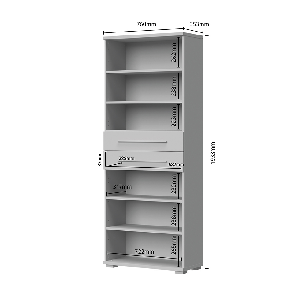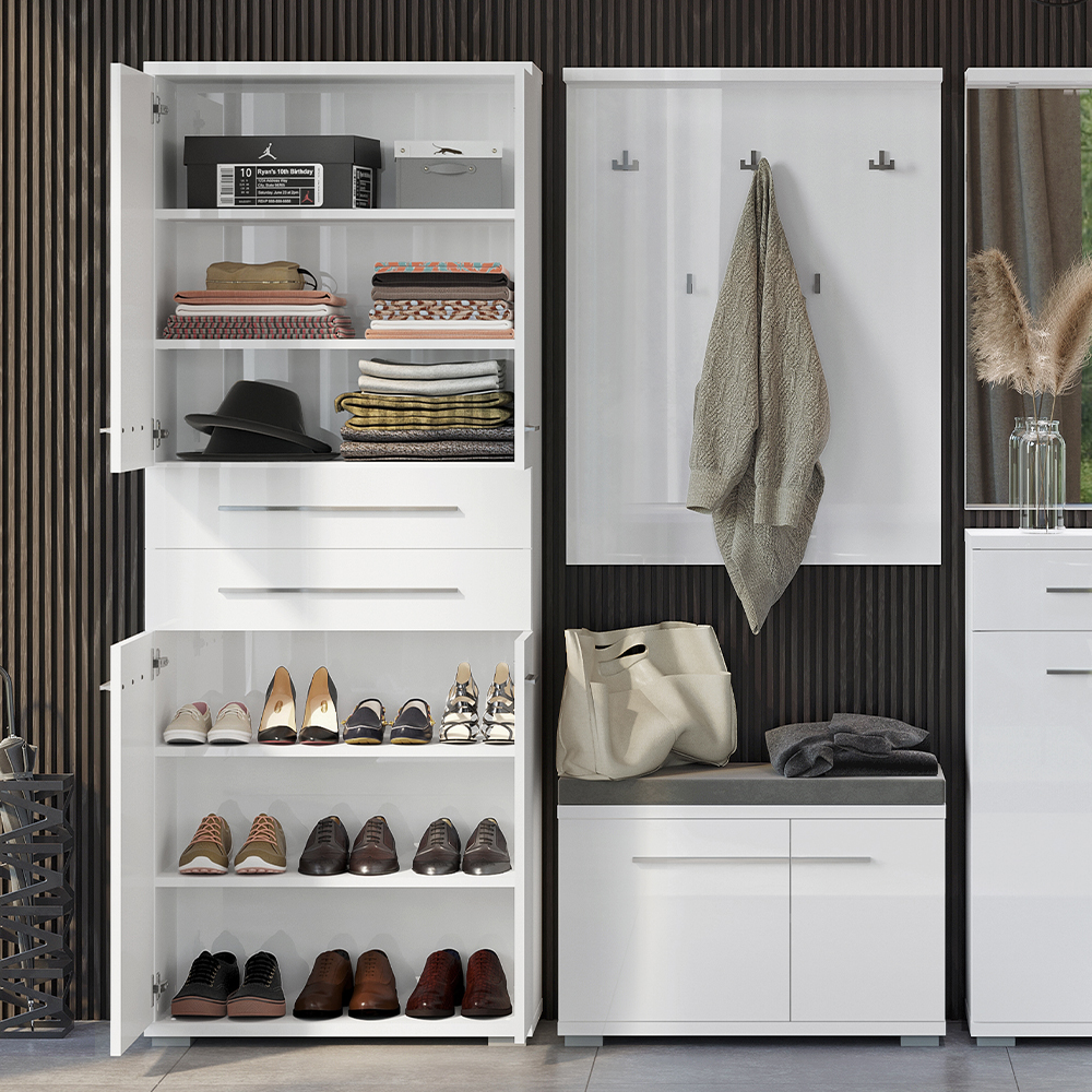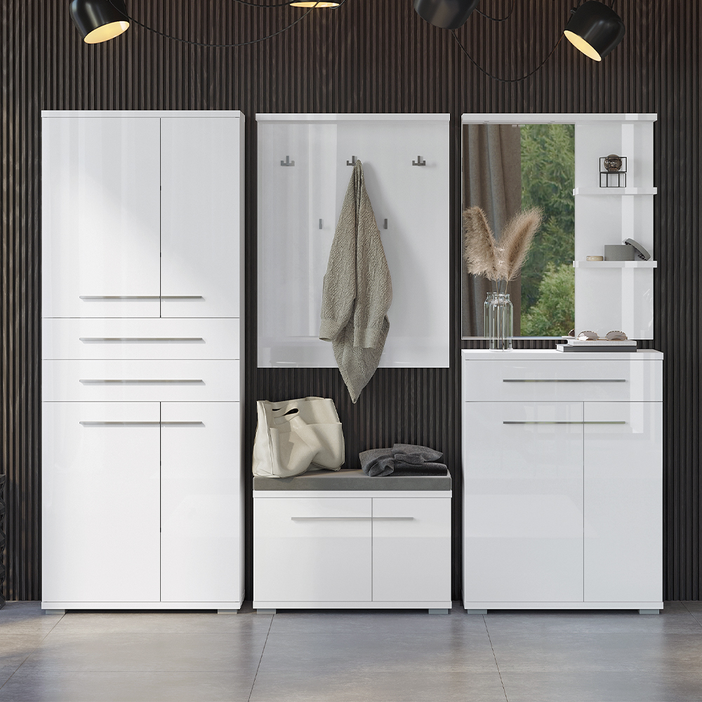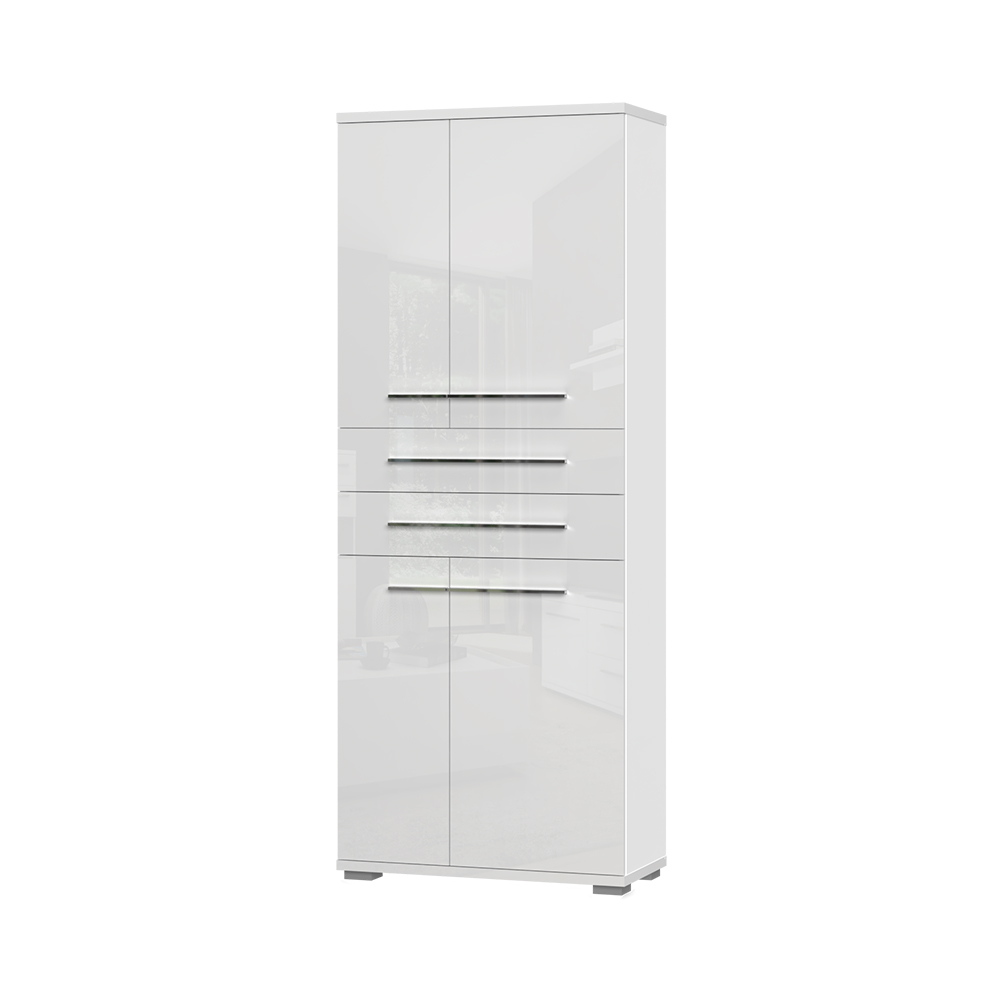 Vitrina za predsoblje iz kolekcije PIANO sa četiri asimetrična krila i dve fioke, svedenog i elegantnog dizajna.